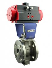 气动V型球阀的工作原理是靠旋转阀恋来使阀门畅通或闭塞。气动球阀开关轻便,体积小,可以做成很大口径,密封可靠,结构简单,维修方便,密封面与球面常在闭合状态,不易被介质冲蚀,在各行业得到广泛的应用。气动V