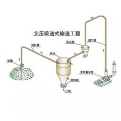 负压输送系统负压吸送气力输送系统一般用罗茨真空泵和离心风机作为动力源,将管路及料罐仓抽成一定的真空度,使进风口在大气压的作用下形成粒料、粉料与气体的两相流,经输送管道输入除尘分离设备。两相流在除尘分离