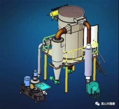 整套机组包括:磨粉主机;旋风分离器;脉冲除尘;高压引风机;电控柜(图示未现)5部分。磨粉主机包括三大部分:1主电机为动力的粉碎部分;2分级电机为动力的分级选粉部分;3送料电机为动力的原料输送部分。主电