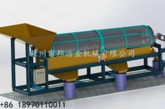 当生活垃圾发电厂炉渣金属物料进入滚筒装置后,由于滚筒装置的倾斜与转动,使筛面上的物料翻转与滚动,使合格物料(筛下产品)经滚筒外圆的筛网排出,不合格的物料(筛上产品)经滚筒末端排出。由于物料在滚筒内的翻