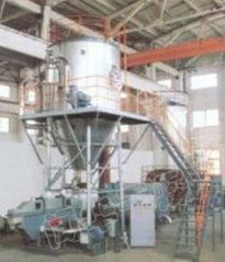 离心喷雾干燥工作原理:空气经过滤和加热,进入干燥器顶部空气分配器,热空气呈螺旋状均匀地进入干燥室。料液经塔体顶部的高速离心雾化器,(旋转)喷雾成细微的雾状液珠,与热空气并流接触在短时间内可干燥为成品。