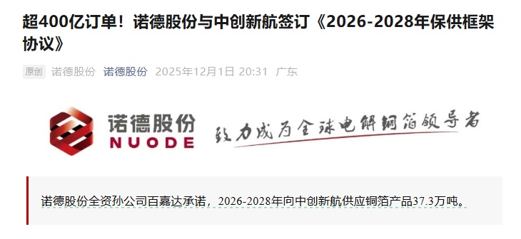 12月1日,锂电铜箔巨头诺德股份发布消息称,公司全资子公司深圳百嘉达新能源材料有限公司(简称“百嘉达”)与中创新航签订了《2026-2028年保供框架协议》。“基于双方长期稳定的战略合作,为保证百嘉达铜箔产品的供应稳定,百嘉达承诺2026-2028年向中创新航供应铜箔产品37.3万吨。”