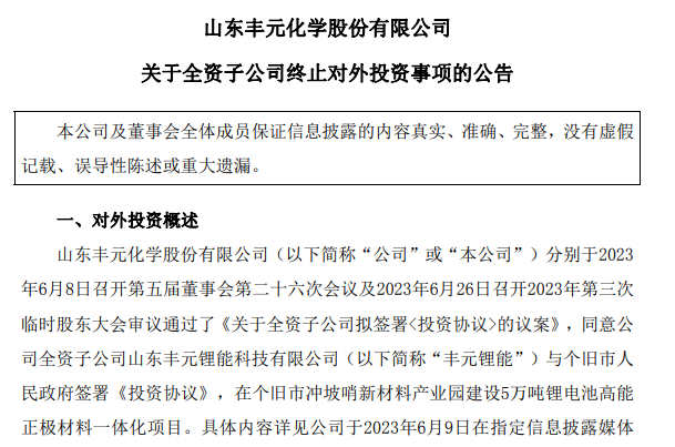 8月30日,山东丰元化学股份有限公司发布公告,宣布全资子公司山东丰元锂能科技有限公司将终止在个旧市的对外投资事项。