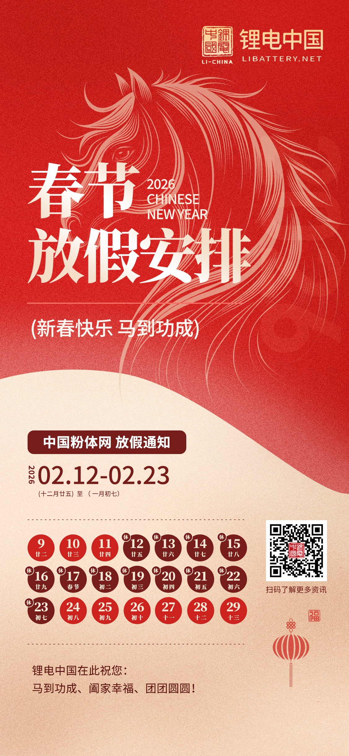2026年2月12日至2月23日,锂电中国全体员工放假,网站在此期间将暂停信息更新和相关服务。2月24日开始正常上班,各项服务恢复正常。